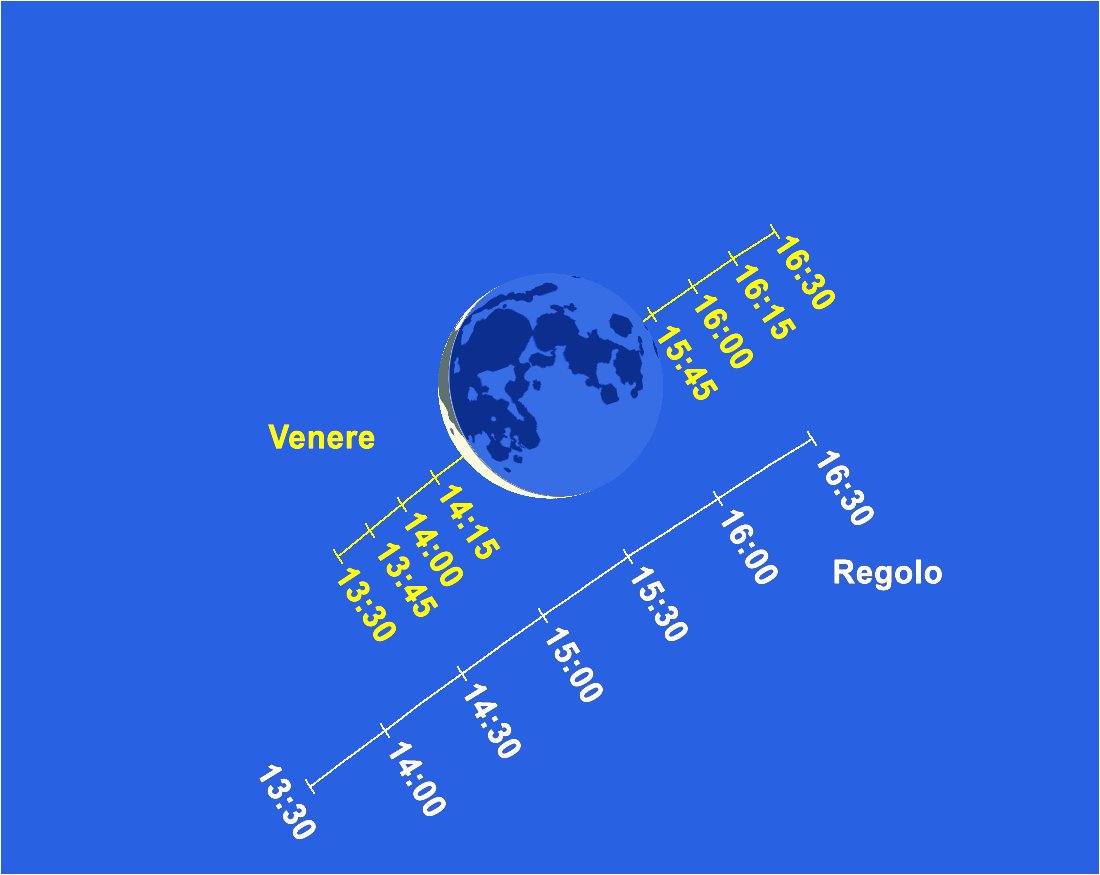 A partire dalle 14:19 circa, una sottile falce di Luna calante (illuminata al 6%) occulta Venere (mag. -3,9). La scomparsa graduale del pianeta, che si presenta con un disco quasi completamente illuminato (89%) di 11”,5 di diametro, dietro il lembo illuminato si verifica tra le 14:13 (AO) e le 14:39 (CT), mentre la riapparizione sul bordo oscuro del disco lunare avviene poco più di un’ora dopo; 31’ a sud di Venere si trova anche Regolo.