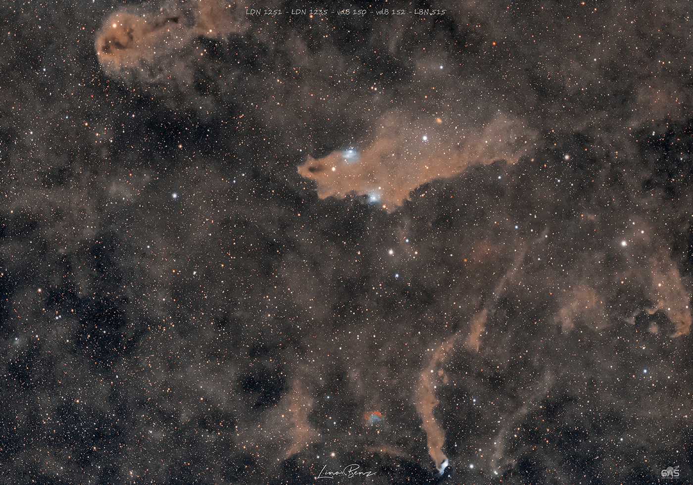 LDN 1235 ( Nebulosa Squalo) è una nebulosa oscura/a riflessione nella costellazione di Cefeo, a circa 650 anni luce di distanza. La nebulosità è composta da polvere interstellare che nasconde gran parte della luce retrostante, sono visibili anche le due Nebulose a riflessione azzurre, vdB149 e vdB150. In alto a sinistra LDN 1251 è una complessa nube di polvere e gas situata nella costellazione di Cefeo, a circa 1000 anni luce dalla Terra. È un importante sito di formazione stellare e contiene strutture oscure e oggetti Herbig-Haro, nonché parte del più vasto complesso molecolare del Cefeo. In basso dell’immagine si trova la piccola nebulosa a riflessione vdB 152 che con LDN 1221 forma la Wolf’s Cave Nebula ( Grotta del Lupo ) destra nella parte centrale troviamo la LBN 515. Vicino alla Cave si intravede la PK 111+11.1 una piccola planetaria, dista circa 1.300 anni luce.