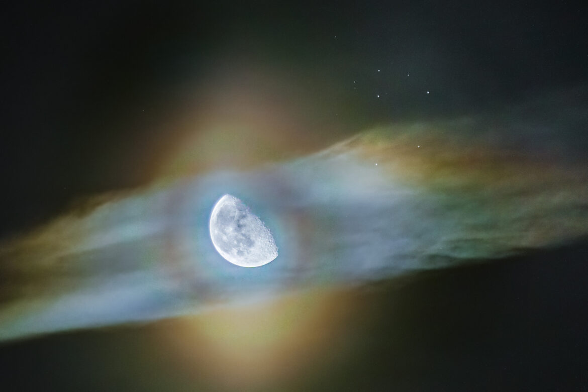 Volevo che questa foto della congiunzione fosse il più realistica possibile, dato che non amo molto usare tecniche di fusione per questi momenti. Non è stato facile, nonostante molti tentativi, questa è stata l’unica cattura HDR che sono riuscito a fondere senza artefatti. Ma eccola qui: una splendida corona lunare con un bellissimo alone, accompagnata dalle Sette Sorelle.