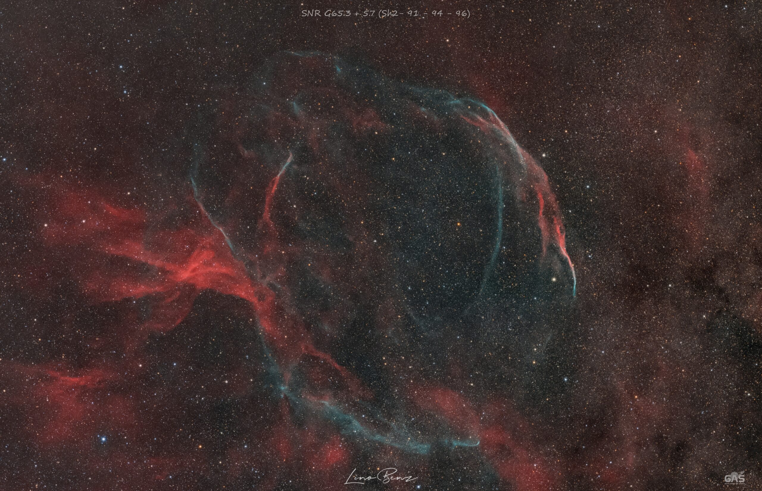 SNR G65.3+5.7 è un debole e diffuso residuo di supernova,situato nella costellazione del Cigno, che include parte della regione catalogata come Sh2-91, Sh2-94 e Sh2-96. È un obiettivo difficile a causa della sua bassa luminosità superficiale e della densità stellare del fondo ( ho dovuto rimedinsionarle ) , ma è visibile con strumenti a grande campo e filtri appropriati. Ha una dimensione angolare di circa 3×4 gradi, simile a quella della più famosa Nebulosa Velo nel Cigno. Si presenta come una serie di filamenti nebulosi, con una predominanza di emissioni OIII (Ossigeno triplo ionizzato) e un debole segnale H-alfa. Si stima che abbia un’età compresa tra i 20.000 e i 25.000 anni e si trovi a una distanza di circa 2.600-3.200 anni luce dalla Terra.