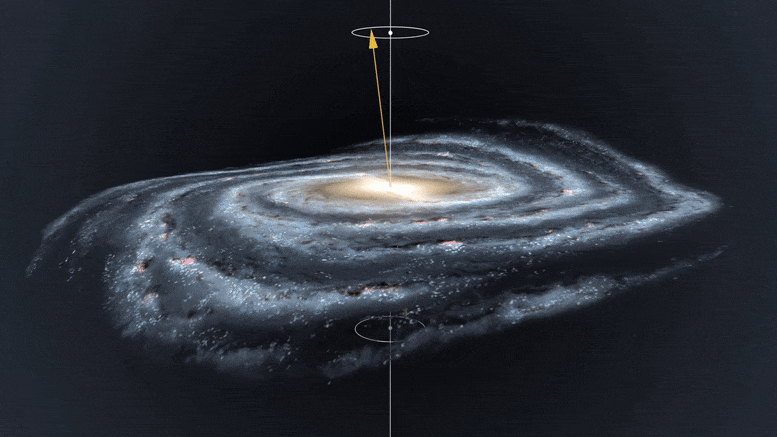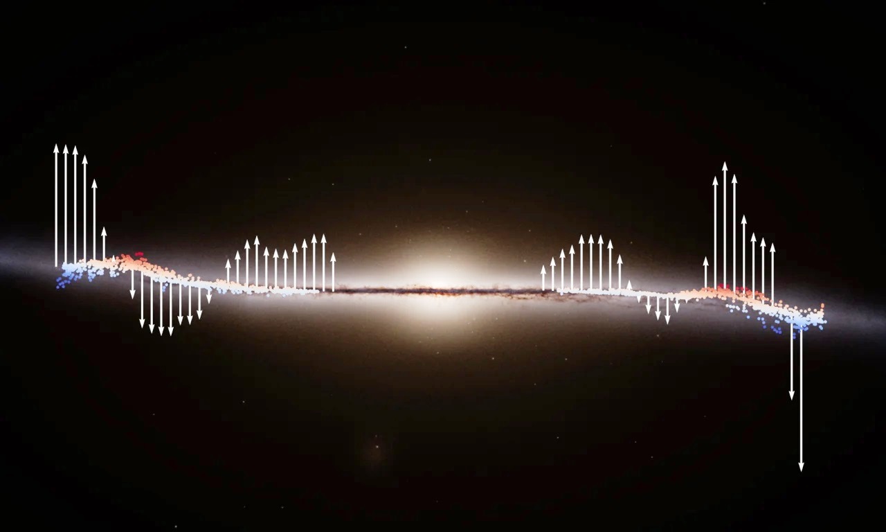 Nella figura di apertura, la linea luminosa al centro rappresenta il piano galattico, osservato di taglio. Le frecce bianche indicano i moti delle stelle misurati da Gaia: alcune si sollevano, altre scendono, tracciando l’andamento ondulato del disco. I punti rossi e blu mostrano le posizioni delle stelle utilizzate nello studio (Esa/Gaia/Dpac, S. Payne-Wardenaar, E. Poggio).