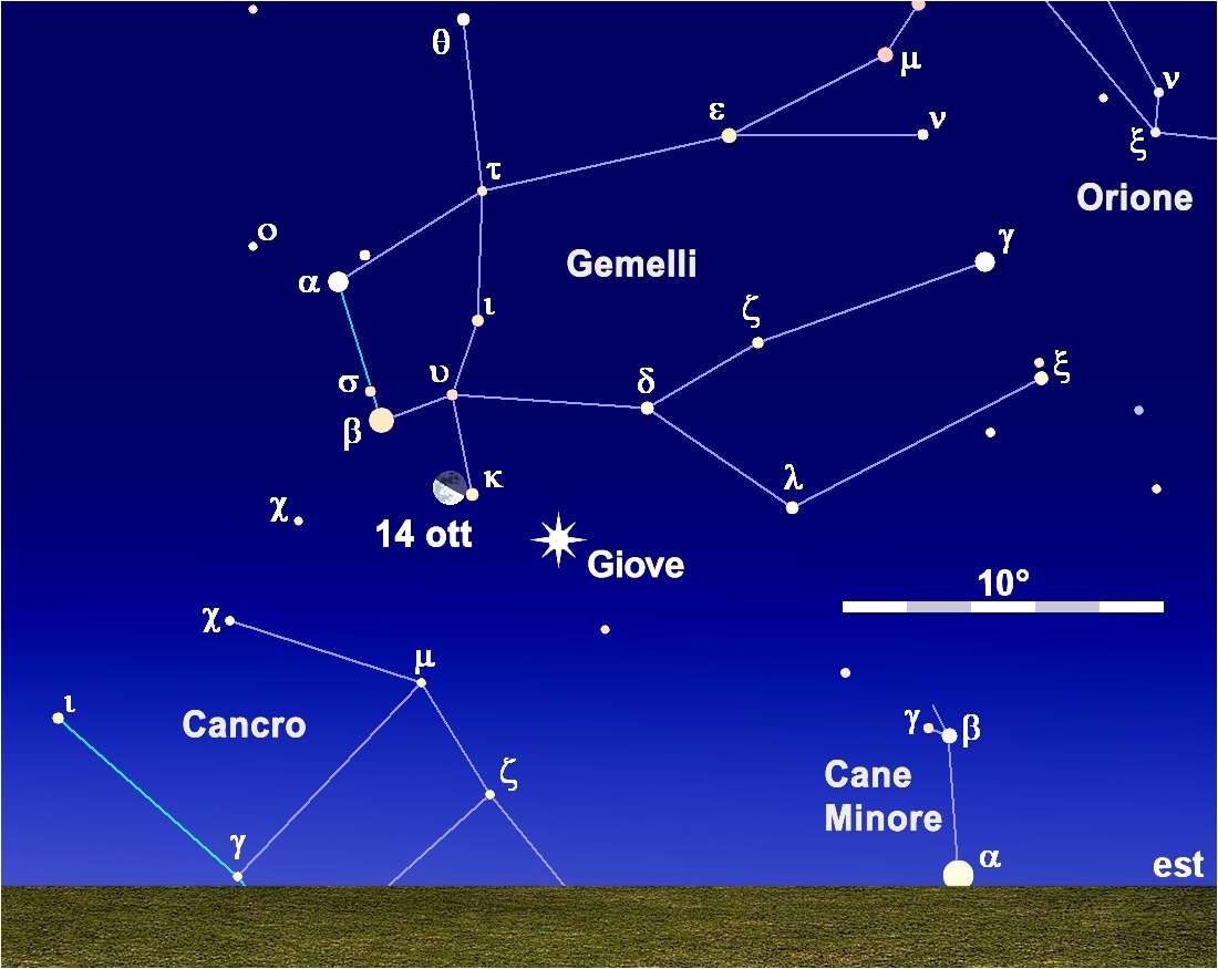 La configurazione raffigurata nel disegno è quella che è possibile osservare alla 01:00 TC del 14, con la Luna una decina di gradi sopra la linea dell’orizzonte e in congiunzione con Polluce, 3° a sud di Beta Geminorum.