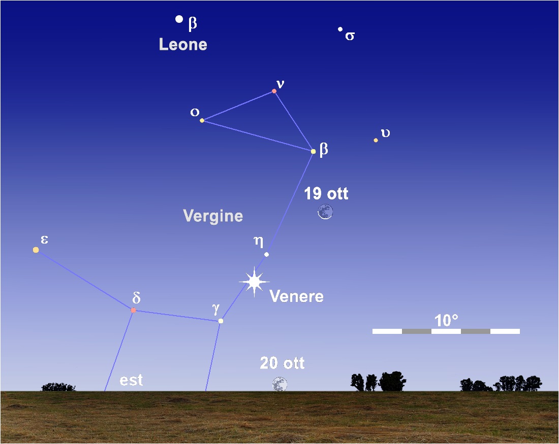 La visibilità mattutina di Venere è in costante diminuzione e nell’ultima decade di ottobre il pianeta sorge tra le prime luci dell’alba. La mattina del 19 all’inizio del crepuscolo nautico, quando è possibile distinguere la linea dell’orizzonte, a oriente è visibile la brillante “scintilla” di Venere, preceduta, a 6° di distanza, da una sottile falce di Luna calante.