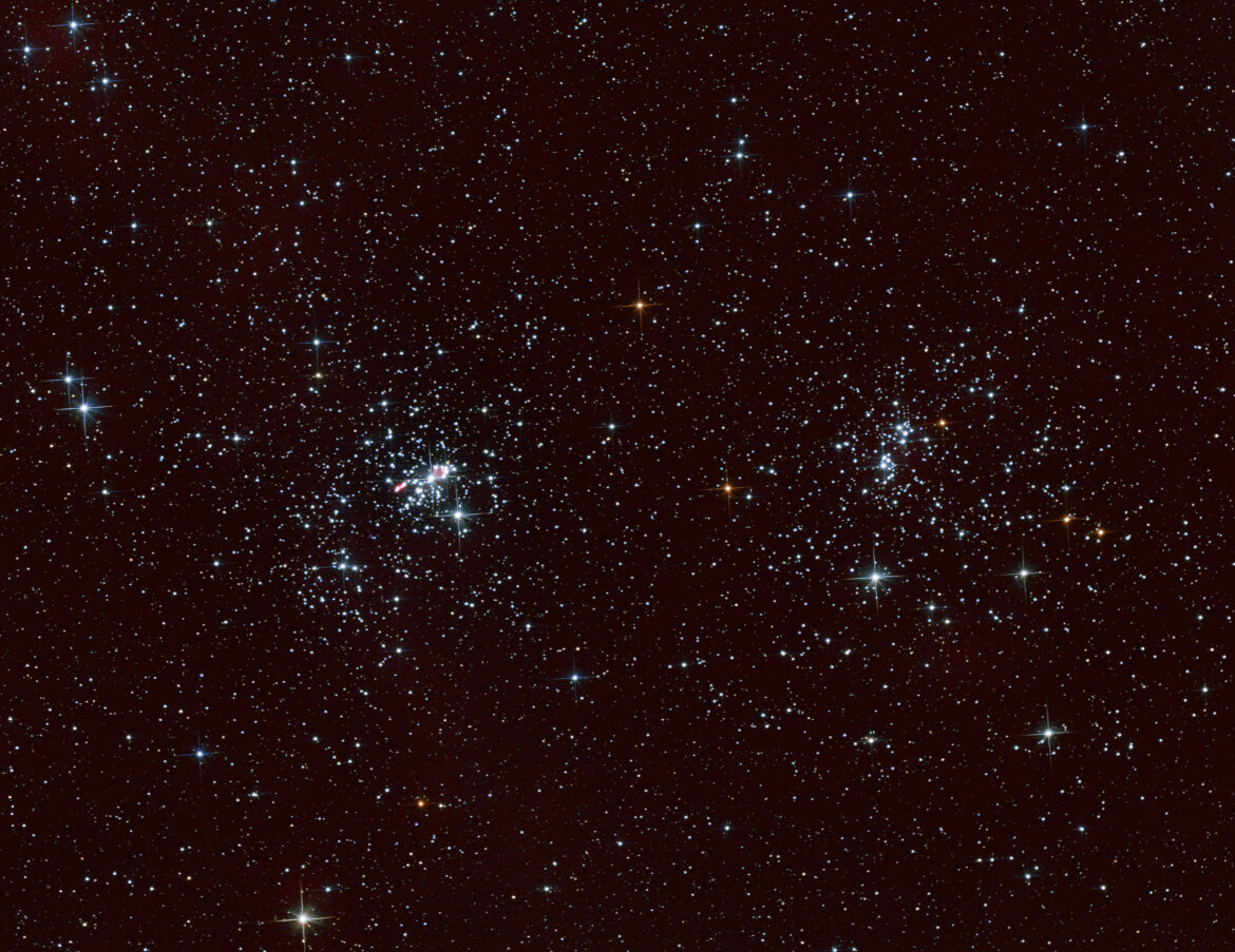 Il Doppio ammasso di Perseo è una coppia di ammassi aperti molto luminosi, visibili nella costellazione di Perseo , distanti oltre 7.000 anni luce dalla Terra mentre distano 800 anni luce tra loro. Sono molto conosciuti anche dall’antichità , addirittura nel 130 a.c è stato notato a occhio nudo. Per apprezzarne la bellezza è consigliabile l’uso di un binocolo o di un piccolo telescopio. in fotografia a lunga esposizione si possono ammirare molte stelle fredde blu-bianche e altre più calde tendenti al giallo