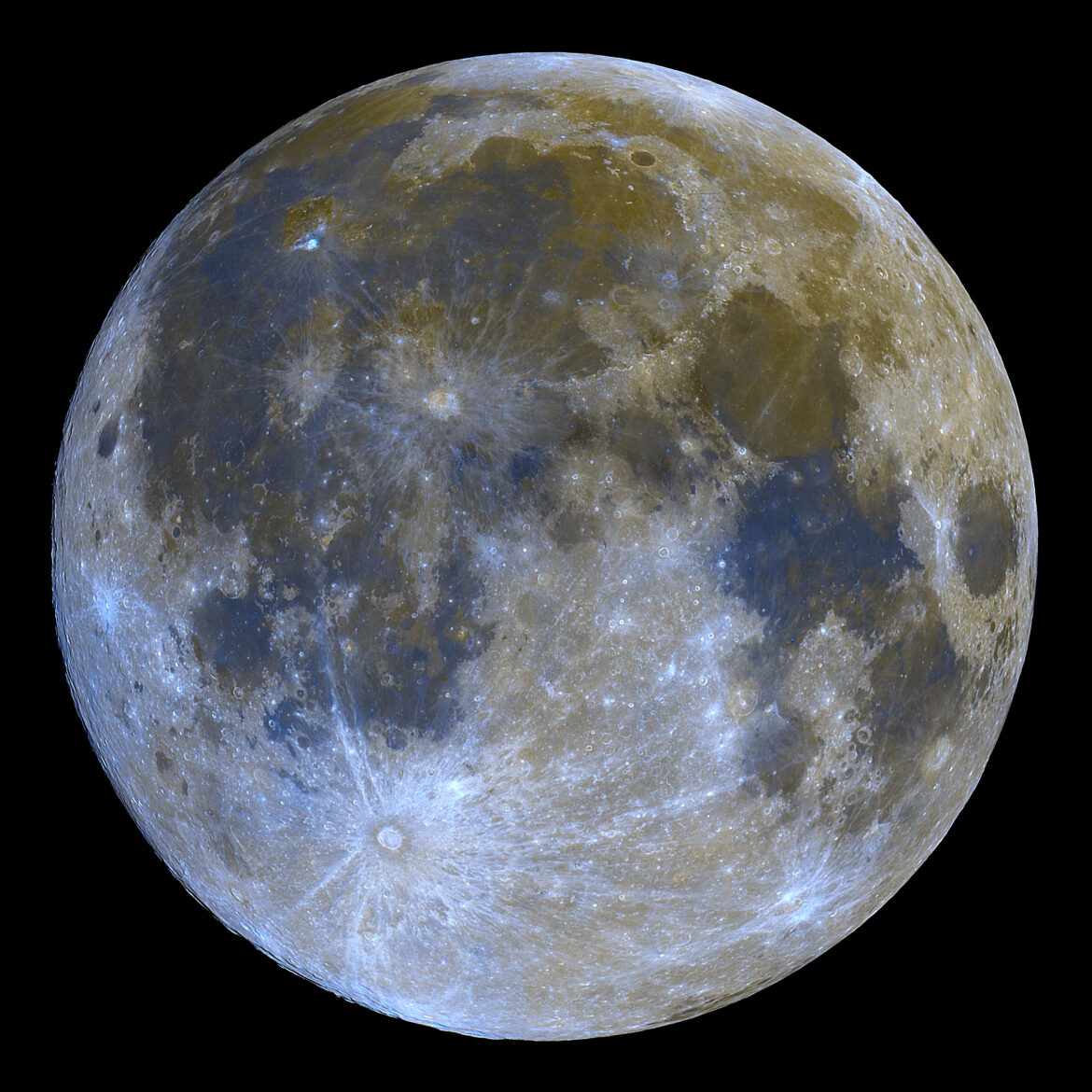 Nella notte tra 6 e 7 ottobre, grazie alle ottime condizioni del cielo, ho effettuato alcune riprese alla Luna in fase piena, poi le ho elaborate e le immagini risultanti le ho assemblate per formare questo mosaico. Ho poi aumentato la saturazione dei colori per mostrare la diversa composizione chimica della regolite lunare. A causa di un leggero aumento del diametro apparente, causato dalla minore distanza, questa viene chiamata Superluna e la prossima si verificherà il 5 novembre, con il nostro satellite che si troverà ancora più vicino al perigeo, al punto di minima distanza da noi.