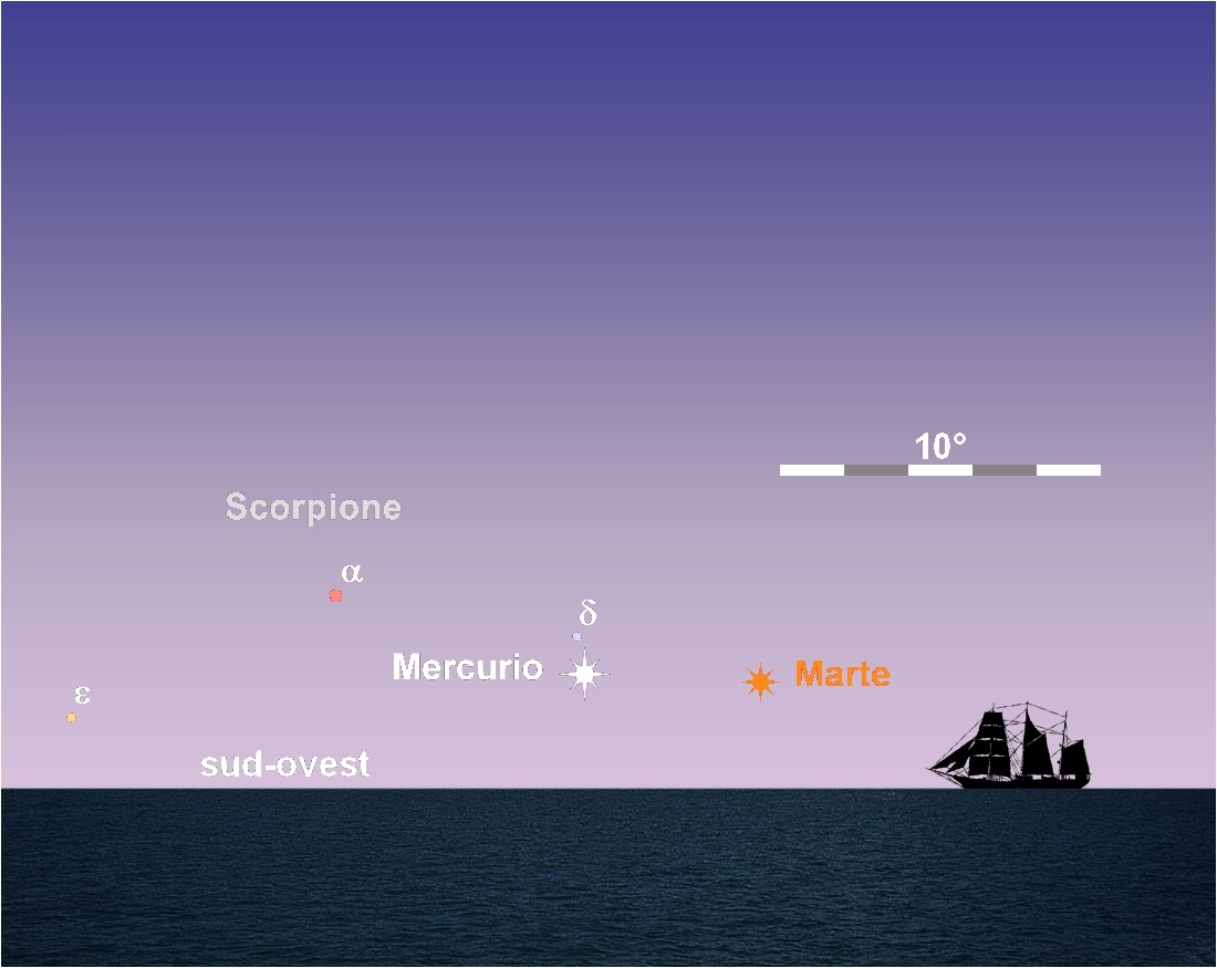Dopo il transito della Luna, Mercurio e Marte si muovono quasi parallelamente, separati da una manciata di gradi, con il secondo cinque volte meno luminoso del primo. Negli ultimi giorni del mese, Mercurio raggiunge la massima visibilità serale della corrente apparizione che, causa la piccola inclinazione apparente tra orizzonte ed eclittica, risulta essere la meno favorevole dell’anno.