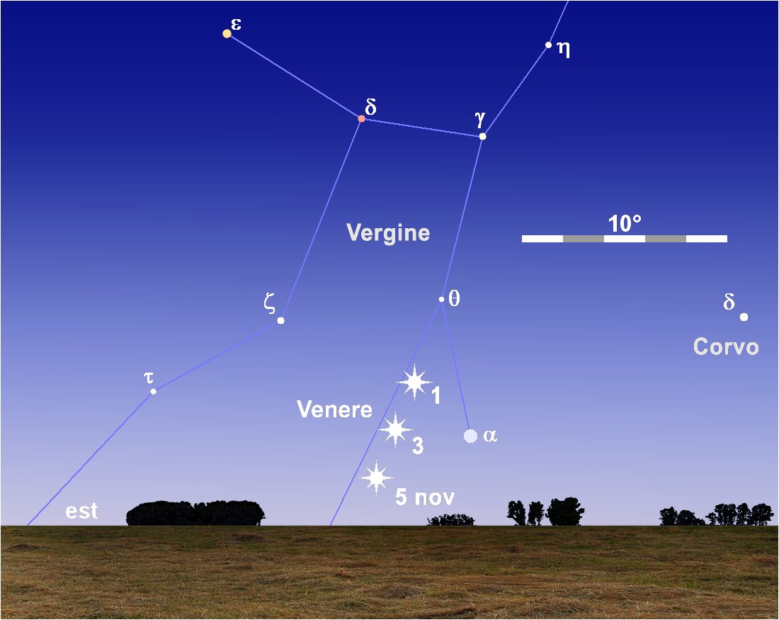 Nei primi giorni del mese, tra le luci dell’alba, in prossimità dell’orizzonte orientale è possibile ammirare la luminosa scintilla di Venere affiancare e superare Spica. Il confronto delle posizioni relative del pianeta e della stella in mattine successive permetterà di evidenziare il veloce movimento del primo sulla volta celeste. La congiunzione in Ascensione Retta tra Venere e Alfa Virginis viene raggiunta il 1° novembre, mentre per la minima separazione angolare di 3°,6 si dovrà attendere la mattina seguente.