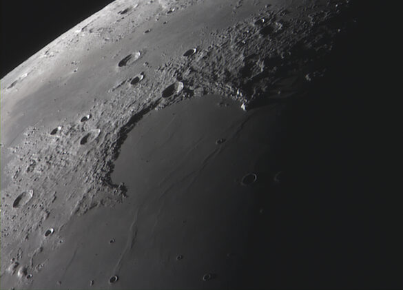 Il Golfo delle Iridi è un antico cratere da impatto quasi completamente sepolto dalla lava basaltica del Mare delle Piogge, situato nella zona nord-occidentale della Luna. La struttura ha un diametro di circa 230 km ed è delimitata dai promontori Laplace (a destra nella foto) ed Heraclides. Vicino ai Monti Jura si trova il cratere Bianchini (circa 40 km di diametro) e all’interno della “baia” si possono notare altri crateri più piccoli e corrugamenti simili a onde. Grazie alla vicinanza al terminatore, si possono anche vedere le lunghe ombre proiettate dal promontorio Laplace e da altre montagne sulla superficie scura del mare Imbrium.