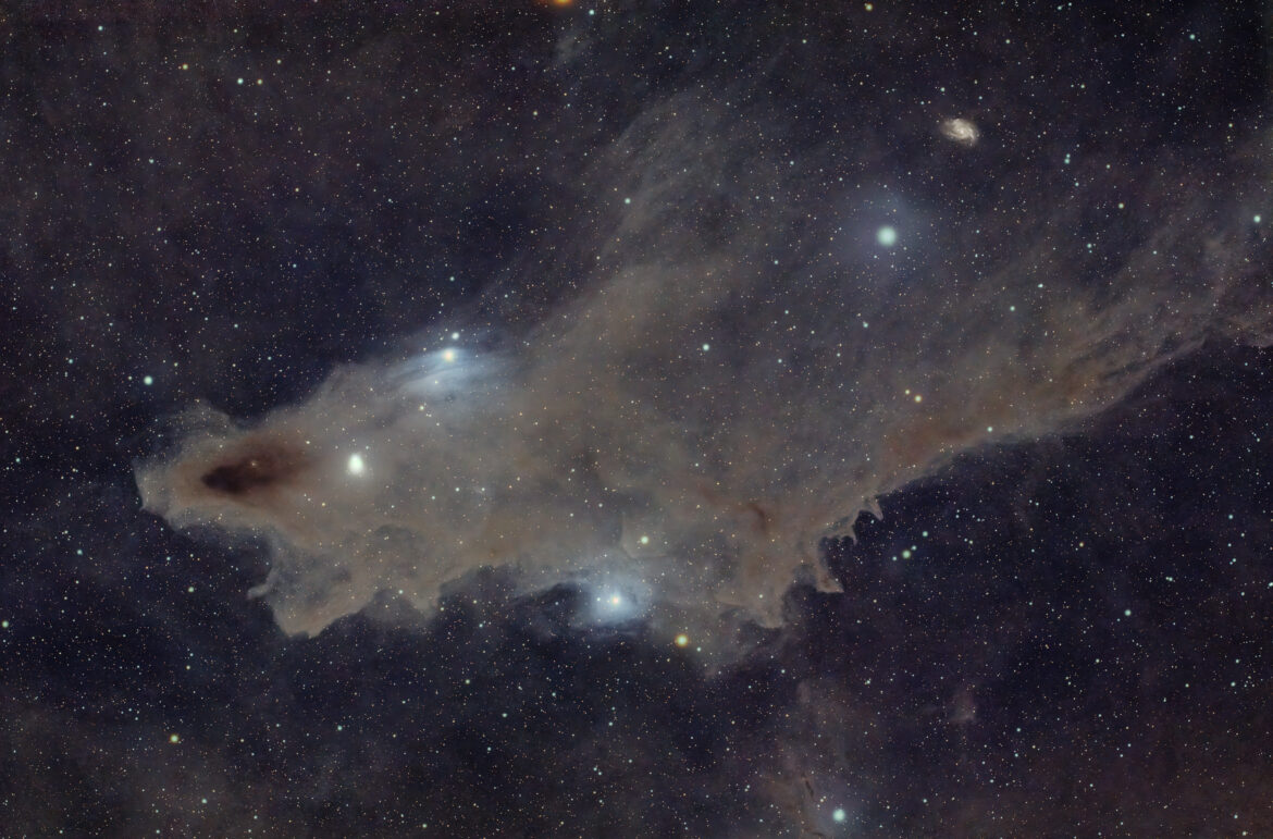 La Nebulosa Squalo LDN 1235 è una vasta nebulosa oscura, parte di una grande nube molecolare, situata nella costellazione di Cefeo, a circa 1000 anni luce dalla Terra. Nello stesso campo è possibile scorgere due nebulose a riflessione VdB149 e VdB150, illuminate dalle stelle vicine. Nel medesimo fotogramma, quasi sull’immaginaria pinna dorsale del vorace squalo, potete osservare PGC 67671, una galassia a spirale, che però si trova molto più distante nello spazio e nel tempo, sita a circa 58 milioni di anni luce dal nostro sistema solare! L’immagine è stata acquisita in due serate del mese di agosto, e dopo varie vicissitudini, finalmente ho trovato tempo e modo di mettervi mano. Che dire, l’emozione che provo nel poter riprendere simili meraviglie, non ha davvero eguali. E’ qualcosa capace di mettermi in pace con me stesso e con il mondo. Anzi, con l’Universo intero. Poterlo fare con una semplicità così disarmante, grazie al mio setup AsiAir, mi ha semplificato notevolmente la vita e mi ha donato un nuovo, irrefrenabile entusiasmo!