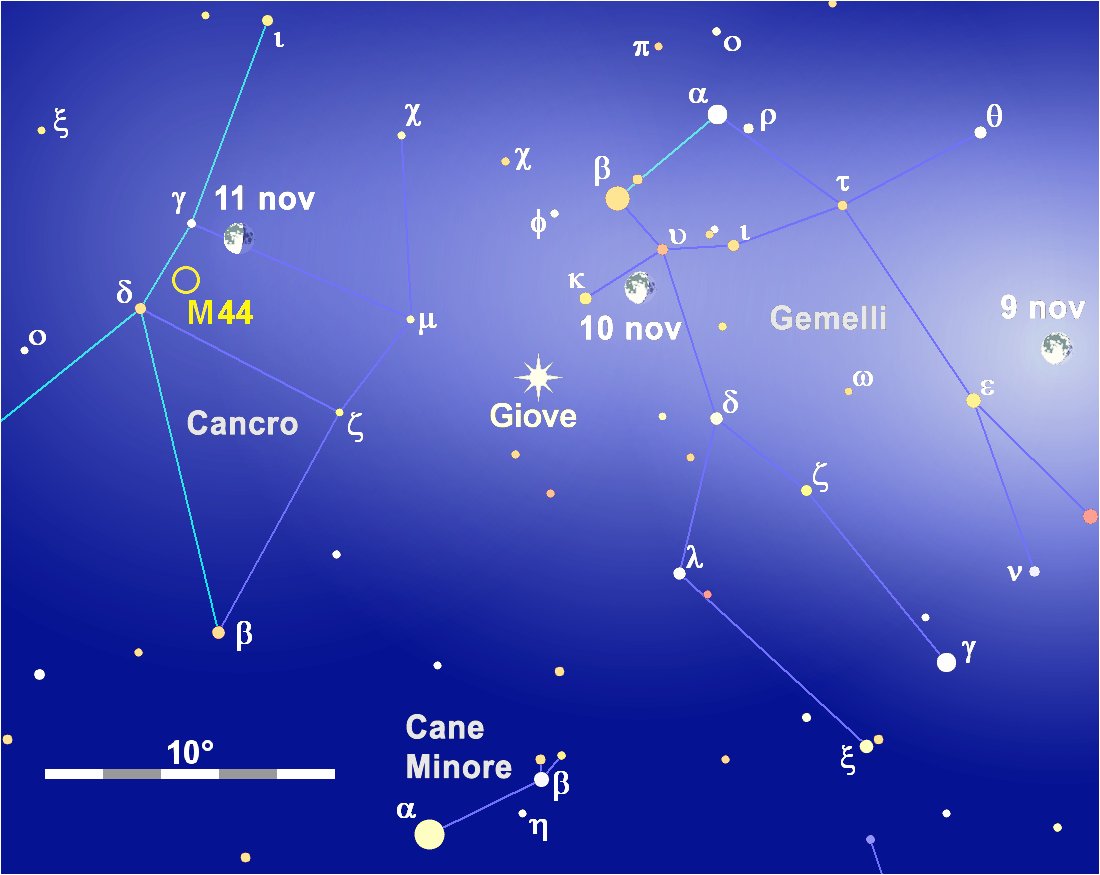 Per gran parte della notte il cielo è dominato dalla luminosa presenza della Luna gibbosa calante che va progressivamente avvicinandosi all’ampia coppia formata da Giove e Polluce (poco meno di 7° più a nord). Le congiunzioni in Ascensione Retta della Luna con Beta Geminorum e Giove, con il nostro satellite naturale in transito quasi a metà tra il pianeta e la stella, si verificano nelle ore diurne e sono pertanto inosservabili.