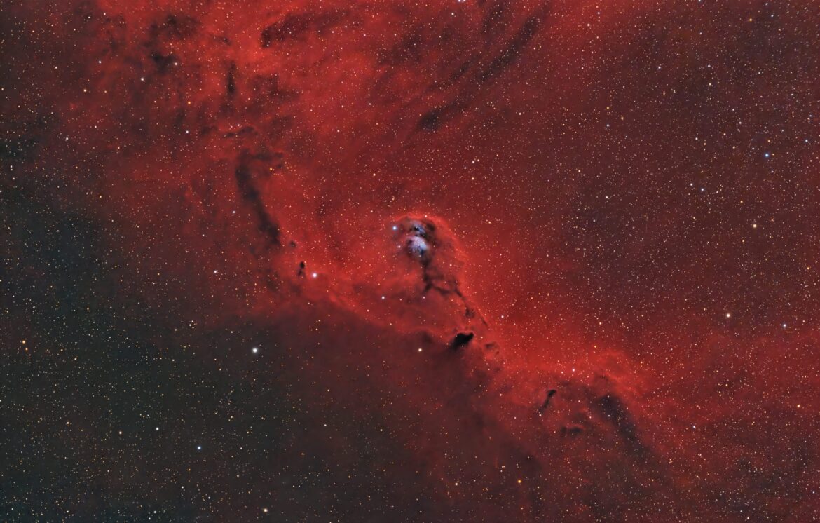 In Orione, una piccola nebulosa a riflessione (Cederblad 51) dalla tonalità azzurrognola è immersa in un mare di idrogeno ionizzato solcato da addensamenti di polveri interstellari.