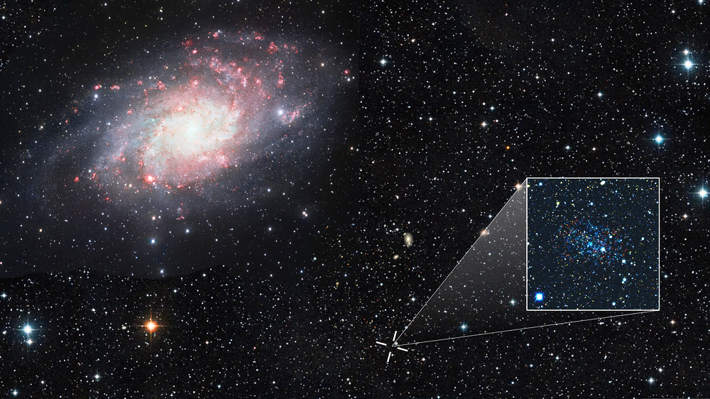 In figura: nelle galassie a spirale come M33 (a sinistra), il legame tra materia visibile e accelerazione gravitazionale è ben consolidato. Le deboli galassie nane, come Eridanus II (a destra), mostrano accelerazioni inferiori. Lo studio rivela che il loro campo gravitazionale non può essere spiegato solo con la materia visibile e conferma la necessità della materia oscura (Eso/Dss2 D. De Martin; Des S.E. Koposov, Aip M. P. Júlio).
