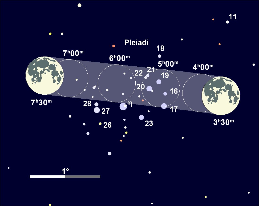 La mattina del giorno 4 la Luna piena attraversa le Pleiadi, occultando numerosi membri dell’ammasso; gran parte degli eventi è visibile da tutta Italia. Il primo fenomeno osservabile è la scomparsa di 16 Tauri dietro il sottilissimo lembo lunare oscuro alle 04:20 (AO), seguito dopo una decina di minuti dalle occultazioni di 17 e 19 Tauri, di mag. +3,7 e +4,3.