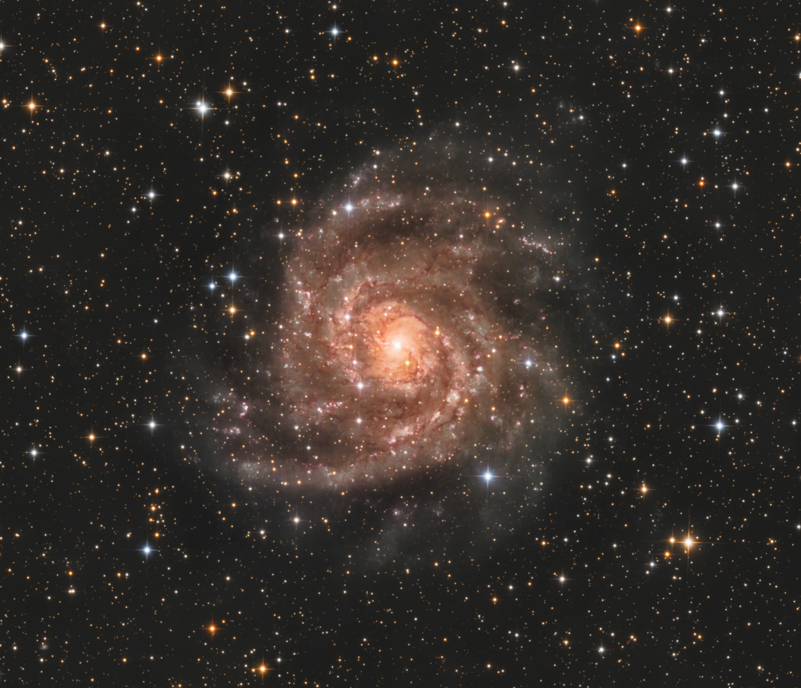 IC 342 (La Galassia Nascosta), una delle galassie a spirale più vicine al di là del nostro Gruppo Locale. IC 342 è estremamente difficile da osservare perché si trova dietro dense regioni di polvere della Via Lattea, quindi la sua luce è fortemente attenuata e arrossata prima di raggiungerci.