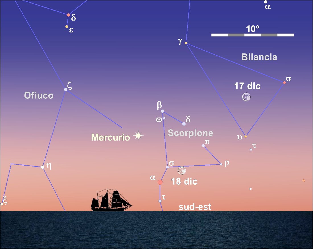 Una bella configurazione celeste è quella che si realizza la mattina del 18 dicembre tra le luci dell’alba. Pochi gradi sopra l’orizzonte sud-orientale è possibile ammirare una sottilissima falce di Luna calante, accompagnata, meno 7° a nord, da Mercurio e 3° a oriente dalla rossa scintilla di Antares. Alcune ore più tardi Mercurio viene a trovarsi in congiunzione con Alfa Scorpii, 5°,7 a nord della stella.