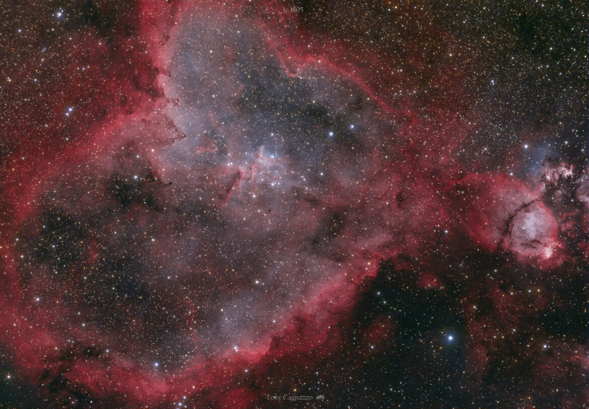 IC 1805 una nebulosa molto estesa che prende il nome di nebulosa cuore. la suo forma delle assomiglia ad un muscolo cardiaco. si trova nella costellazione di cassiopea ed e’ distante circa 7500 anni luce dal nostro sistema solare.