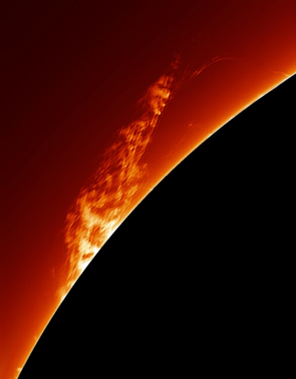 Estesa protuberanza solare apparsa il giorno 9 dicembre 2025. Ripresa eseguita con il rifrattore acromatico Acuter Elite Phoenix a piena apertura (80mm) senza l’utilizzo del filtro frontale Etalon ma solo della diagonale solare Acuter usata come ERF e filtro Omega Optical 31,8mm avvitato sulla camera. Questo setup, sebbene con banda passante ben più larga (0,15nm) rispetto al filtro Etalon Acuter (0,06nm) permette una migliore risoluzione dei dettagli protuberanze, grazie alla possibilità di sfruttare l’intera apertura del rifrattore (contro i soli 40mm del filtro Etalon).