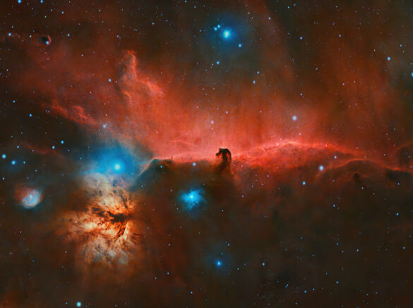 La Nebulosa Testa di Cavallo Ic434 e la Nebulosa Fiamma Ngc2024 sono tra le più belle e caratteristiche del cielo invernale. La Testa di cavallo è parte di un turbine di gas e polveri, che ricorda appunto la testa di un cavallo, da cui il nome. È una delle nebulose maggiormente riconoscibili e note del cielo, anche se è difficile poterla osservare visualmente. In basso a sx è visibile la Nebulosa Fiamma . La loro distanza dalla Terra varia tra i 1350 e i 1500 anni luce.