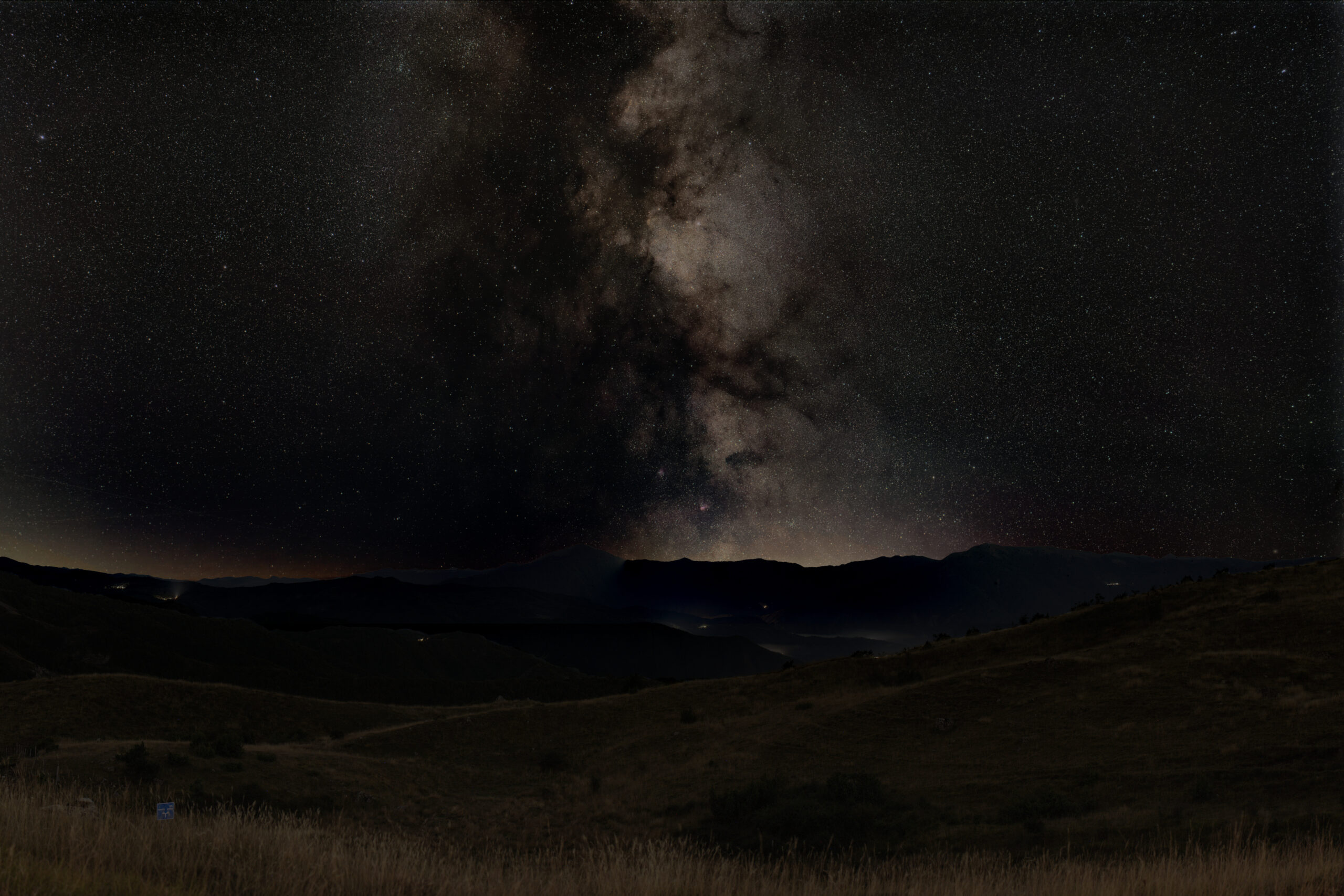 Panorama con Via Lattea, ripresa il 31/8/2025 alla Sella dei Generali, Coli (PC) con Sony ILCE-7RM4+FE 35mm F1.4 GM e inseguitore Omegon MiniTrack LX Quattro NS.