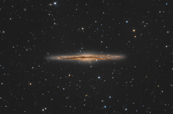 Vista quasi perfettamente di taglio dalla Terra, NGC 891 offre una rara visione di profilo di una galassia a spirale. Il suo sottile disco stellare, la prominente fascia di polvere e l’alone esteso la rendono una delle analogie esterne più vicine e dettagliate della Via Lattea.