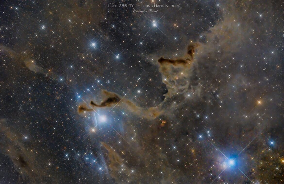 A circa 1500 a.l nella costellazione di Cassiopea, un complesso di polveri e gas, illuminati soltanto dalle stelle retrostanti (nebulosa oscura), si stagliano nello spazio interstellare assumendo le sembianze di una mano che chiede aiuto o che lo dona a sua volta. Un nuovo esempio della varietà di forme e colori che l’Universo ci concede.