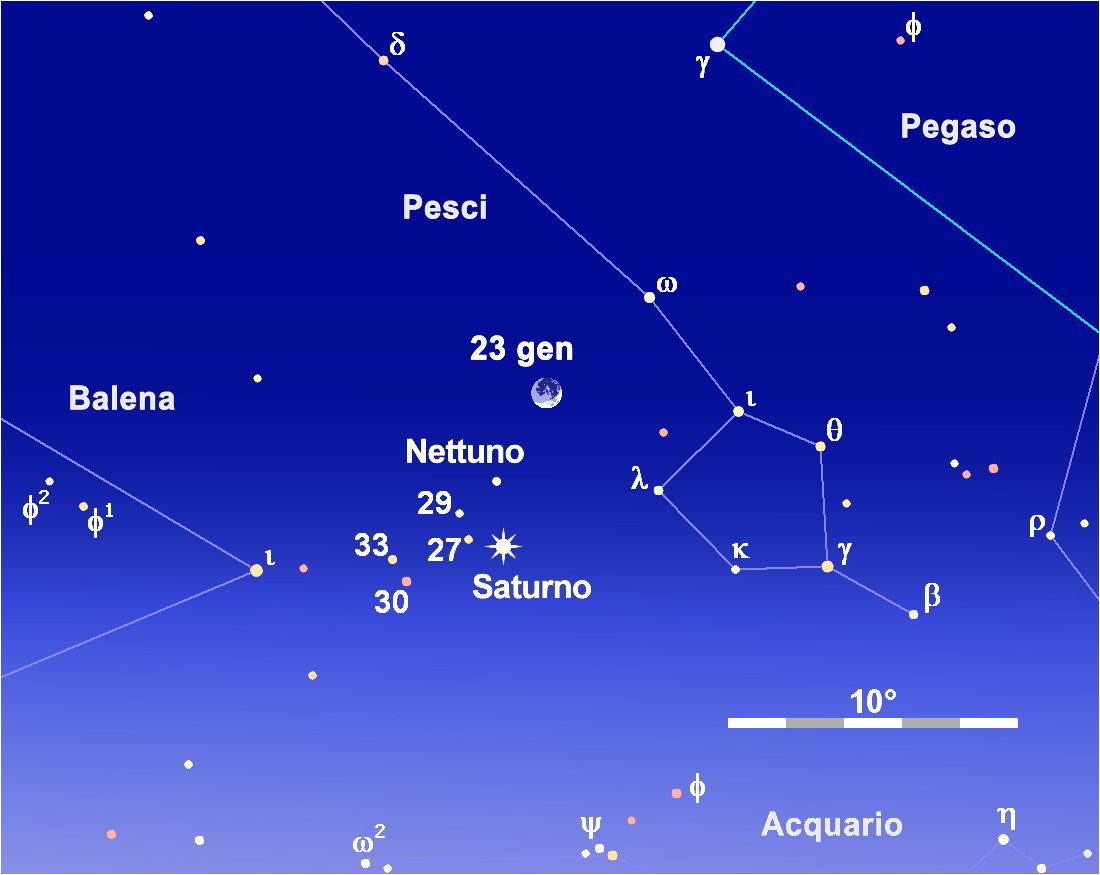 Da diversi mesi ad ogni passaggio della Luna nella costellazione dei Pesci il nostro satellite naturale viene a trovarsi in congiunzione con la coppia di pianeti costituita da Saturno e dal ben più debole Nettuno.