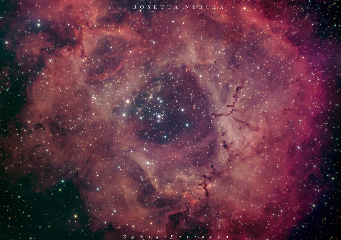 Nebulosa Rosetta: a oltre 5000 anni luce dalla Terra, è una regione di cielo nella costellazione dell’ Unicorno (si esiste davvero!). Al centro un ammasso di stelle (NGC2244) le cui radiazioni ultraviolette “eccitano” gli atomi dei gas della nube che emettono (una volta tornati alla configurazione di equilibrio) luce “colorata”. Predominante è il rosso, emesso da atomi di idrogeno.