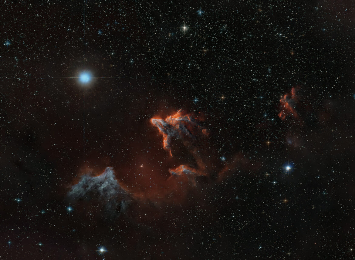 IC 63, nota come il “Fantasma di Cassiopea”, è una debole nebulosa a riflessione e emissione vicina a Gamma Cassiopeiae, appare con sfumature rosse (idrogeno ionizzato) e bluastre (polveri illuminate). È famosa per la sua forma spettrale che ricorda un fantasma, scolpito dalla radiazione ultravioletta della stella vicina, ed è un popolare oggetto di astrofotografia per la sua bellezza. La foto è stata realizzata da Campo Cecina (Carrara) con scatti da 60-180 e 300 sec. per un totale di circa 12 ore. Telescopio Skywatcher 150-750, camera Asi 2600mc, montatura Ioptron Gem28, filtro Optolong L-pro, guida 60-240 con camera Asi 174mm, elaborazione Dss-Graxpert-Photoshop