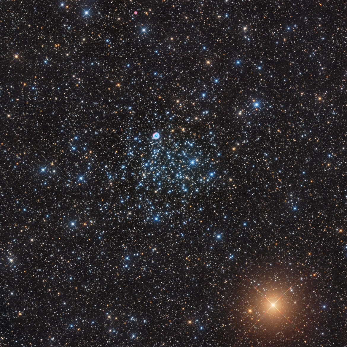 M46 è un ammasso relativamente luminoso e grande, contenente circa 500 stelle, con un’età stimata di 300 milioni di anni. Ha una magnitudine apparente di 6.1 e si trova a una distanza approssimativa di 5400 anni luce dalla Terra.