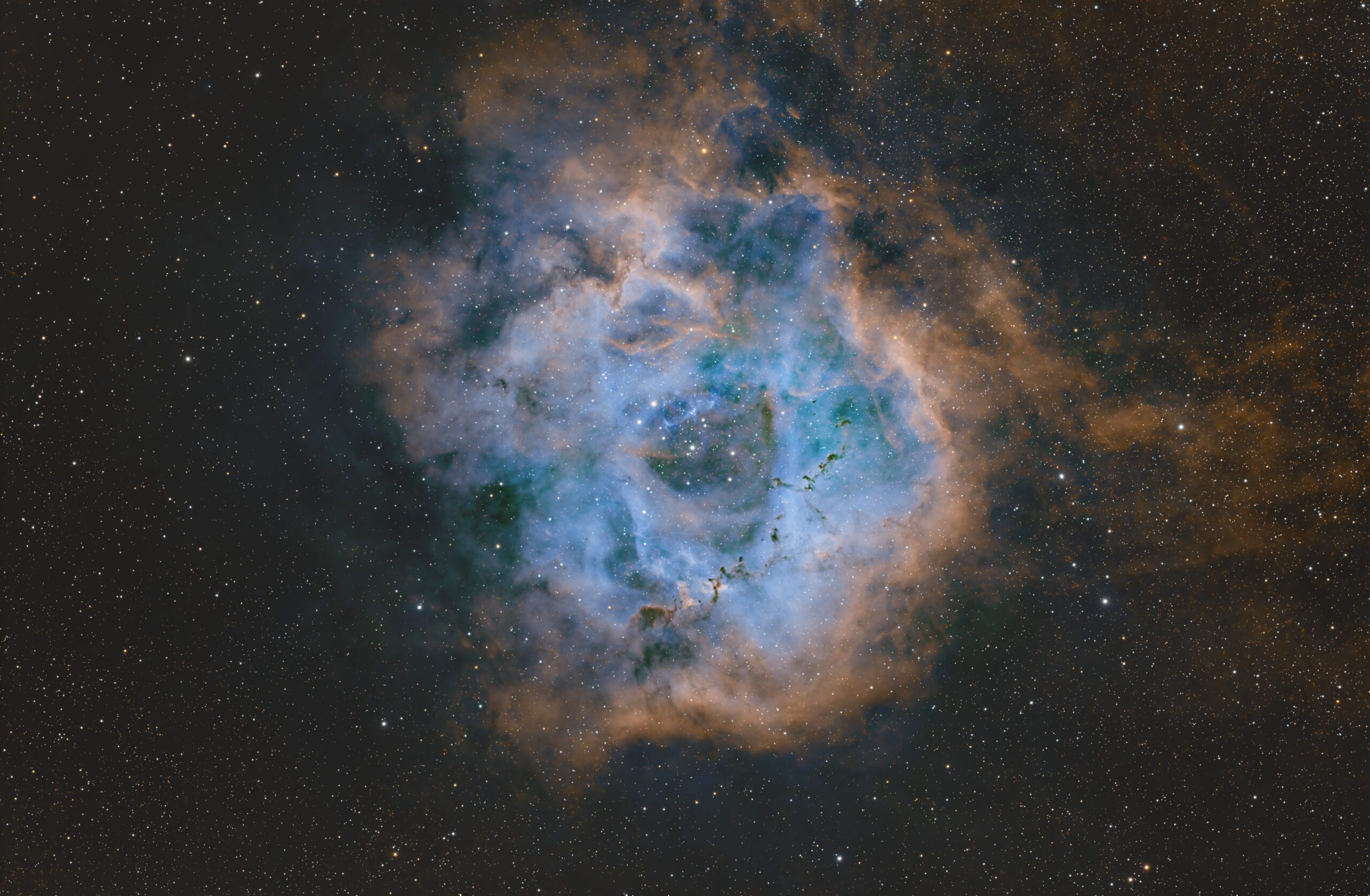 Ho ripreso questa regione con il rifrattore TS 94 EDPH e la camera ZWO 2600mc pro su montatura ZWO AM5. Ho utilizzato due filtri in banda stretta sia per Ha-OIII (Optlong L-enhance) sia per SII-OIII ( Askar D) per circa 12 ore di integrazione dal mio cielo urbano per comporre la Hubble palette.