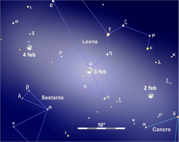 Prima che il cielo rischiari per l’approssimarsi dell’alba, è possibile ammirare una bella configurazione celeste con la Luna ancora “piena” e Regolo nel ruolo di primi attori. La congiunzione in Ascensione Retta tra il nostro satellite naturale e Alfa Leonis, separati in declinazione da appena 31’, si verifica alle 05:43, precedendo di alcuni minuti l’inizio del crepuscolo astronomico.