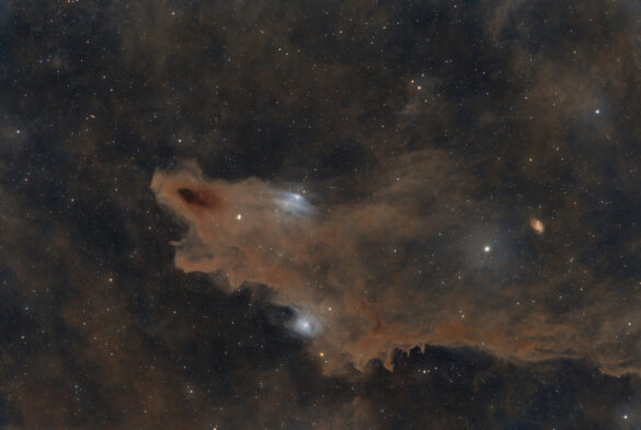 Situata a circa 650 anni luce di distanza, all’interno della “testa” dello squalo sono visibili due regioni bluastre, vdB 149 e vdB 150, dove la polvere riflette la luce di calde stelle vicine, è possibile scorgere anche la piccola galassia spirale PGC 67671, situata invece a ben 81 milioni di anni luce, che brilla timidamente attraverso i veli di polvere della nebulosa.