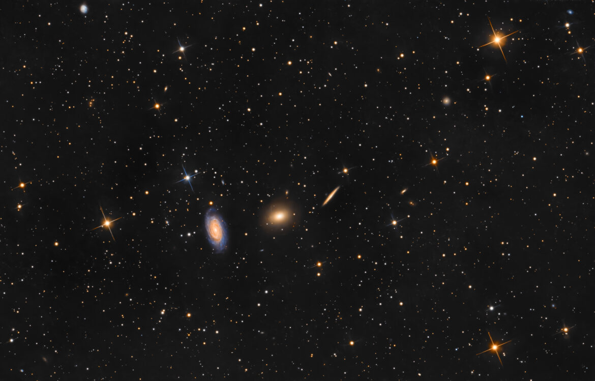 Nella costellazione del Drago si trova un ammasso di galassie le cui componenti più luminose (NGC 5985, NGC 5982 e NGC 5981) formano il gruppo noto come Trio del Drago. Questo gruppo è composto da due galassie a spirale barrate e una galassia ellittica, tutte visibili nello stesso campo anche a lunghezze focali maggiori della mia. È uno spettacolo raro e meraviglioso, sia da osservare che da fotografare.