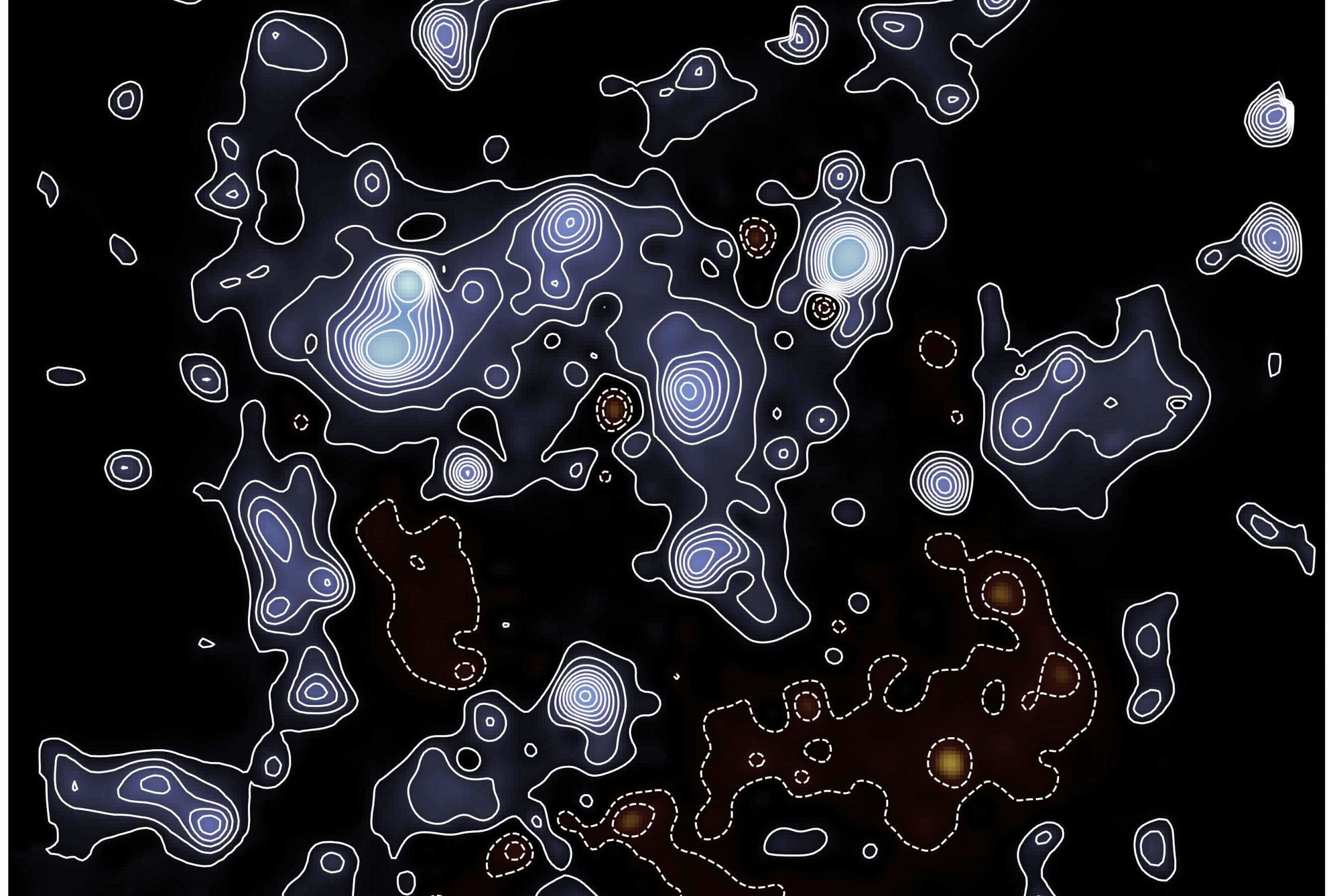 Nella figura di apertura, una porzione della mappa della materia oscura realizzata applicando le tecniche di lente gravitazionale ai dati raccolti dal telescopio Webb nel Cosmos field. I contorni sovrapposti indicano le regioni con uguale densità di materia oscura, evidenziando dove questa materia invisibile, qui rappresentata in blu, è maggiormente concentrata (Leroy/Cosmos-Webb Collaboration).
