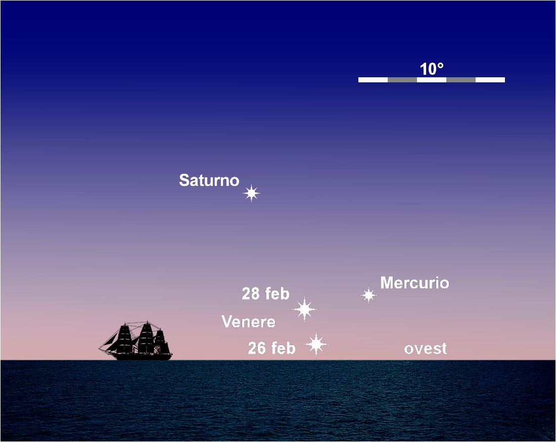 Il giorno 27 i due pianeti si trovano in reciproca congiunzione a poco meno di 5° l’uno dall’altro; anche Saturno, il più alto dei tre, si avvicina, un po’ più lentamente, alle luci del crepuscolo.