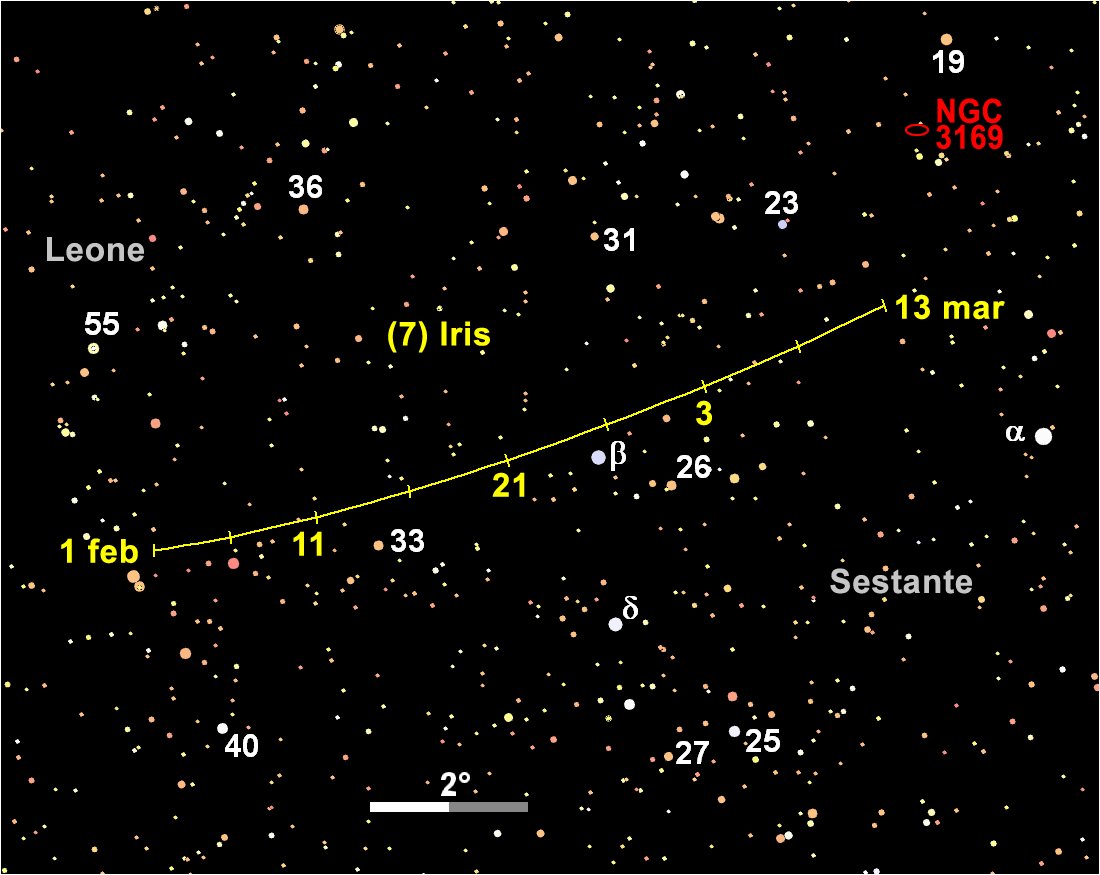 Nel corso del mese il pianetino (7) Iris risulta sufficientemente luminoso per poter essere seguito con piccoli strumenti amatoriali. In opposizione al Sole il giorno 27, quando raggiunge la magnitudine visuale +8,9, (7) Iris è rintracciabile nella parte orientale della costellazione del Sestante, 15° a sud-est di Regolo. Grazie al moto retrogrado da cui è animato il pianetino si sposta in direzione della stella di 5a magnitudine Beta Sextantis, 22’ a nord della quale transita la mattina del 25 febbraio.