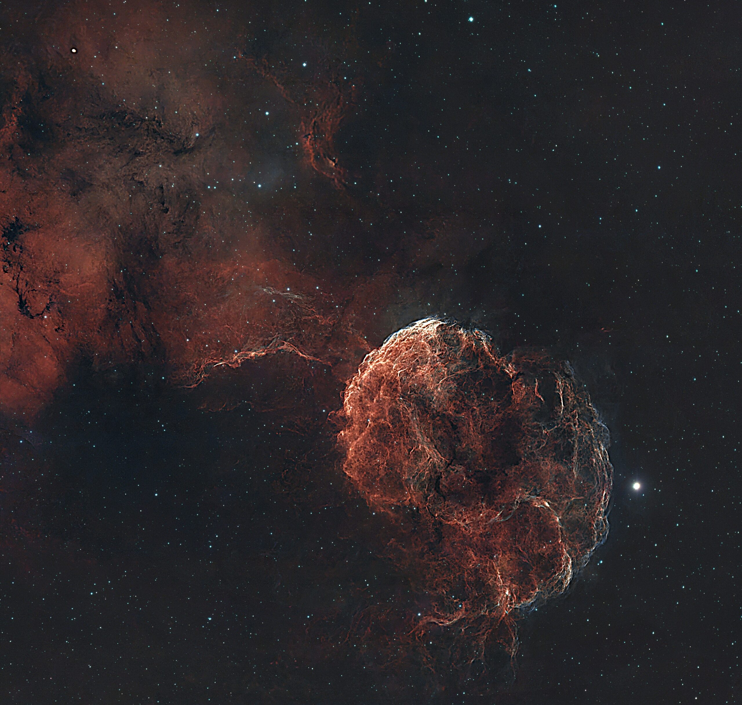 La Nebulosa IC443 è il resto di una supernova esplosa migliaia di anni fa, ora trasformatasi in una stella di neutroni, questo oggetto è molto osservato dagli astronomi a causa delle interazioni con le nubi molecolari che lo circondano. La nebulosa IC 443 si estende su di uno spazio di circa 70 anni luce. Questa nebulosa si sviluppa in un ambiente in continuo cambiamento a causa di stelle molto massicce al suo interno, che dopo una vita relativamente breve (circa 30.000.000 di anni) esplodono in supernove interagendo con l’ambiente circostante, creando altri complessi nebulosi di grossa entità, dista 5000 anni luce nella costellazione dei gemelli