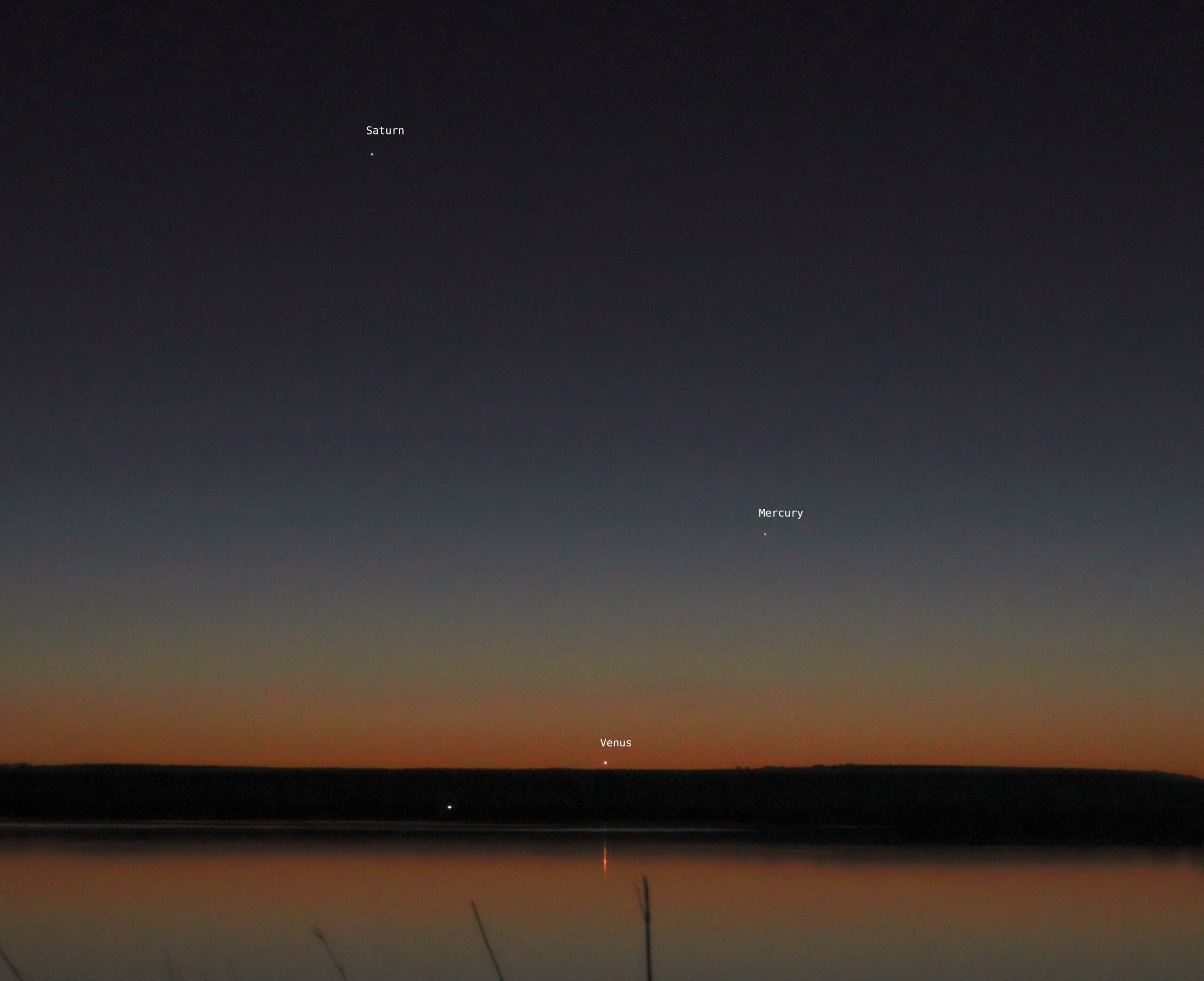 Questa è una foto dei tre pianeti visibili durante il crepuscolo che ho scattato la sera prima della congiunzione. In ordine di altezza abbiamo quindi Venere vicina al tramonto, Mercurio e Saturno. Si vede bene anche il riflesso del pianeta Venere sull’acqua dello stagno.