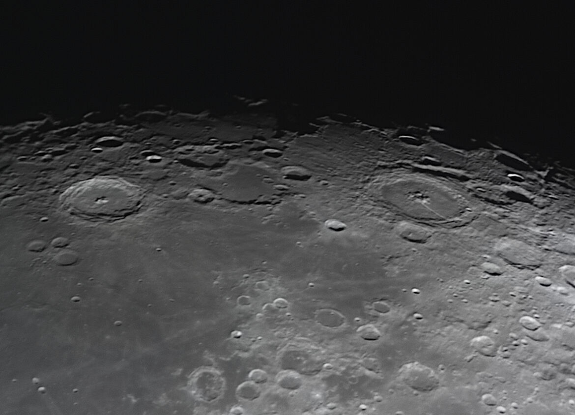 Con un seeing leggermente favorevole, ho deciso di riprendere questa zona della Luna ricca di crateri, situata sul bordo meridionale del Mare Fecunditatis. Nella foto, a destra, il cratere più grande è Petavius con i suoi 182 Km di diametro, al suo interno si può vedere bene anche la Rima Petavius, lunga circa 80 Km. Più al centro si vede il cratere Vendelinus (150 km di diametro) e tre crateri sul bordo: Lohse, Lame e Holden. A sinistra, il grande cratere visibile è Langrenus con un diametro di circa 132 Km.