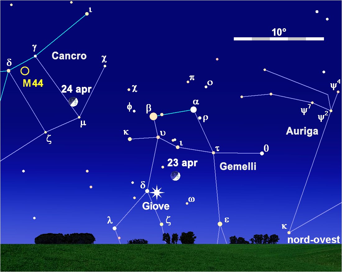 Ormai abituati a seguire il transito mensile della Luna nella costellazione dei Gemelli, dove è situato anche Giove, la notte tra il 23 e 24 aprile sarà possibile assistere a un ulteriore passaggio del nostro satellite naturale 2°,8 a nord di Giove la mattina del 23. Questo passaggio sarà seguito, alcune ore più tardi e non direttamente osservabile, dalla congiunzione di Polluce (Beta Geminorum) con il Primo Quarto di Luna, 3°,9 a sud. È inosservabile anche la congiunzione con il Presepe del giorno 24.