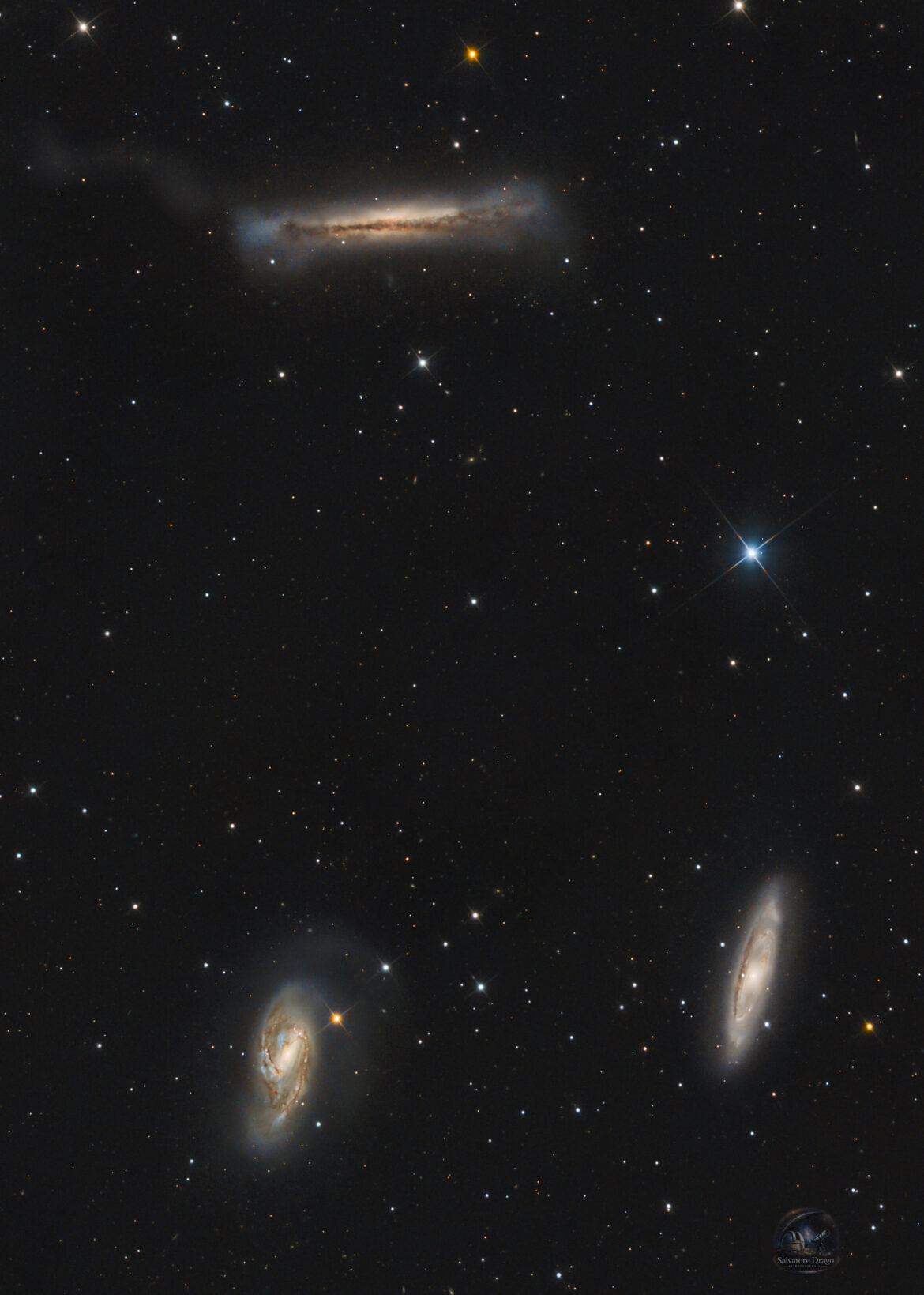 Il Tripletto del Leone è uno dei gruppi di galassie più iconici del cielo primaverile. Situato nella costellazione del Leone a circa 35 milioni di anni luce dalla Terra, è composto dalle galassie spiraliformi M65, M66 e dalla galassia vista di taglio NGC 3628.