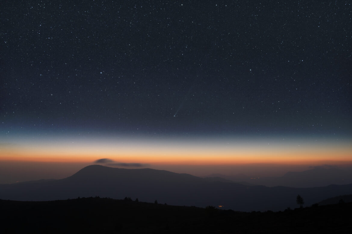Immagine della cometa C/2025 R3 (Panstarrs) ripresa al crepuscolo pochi minuti prima dell’alba alla Sella dei Generali (PC) il 17/04/2026 alle 05:07, in quel momento la coda si estendeva per più di 15 gradi; stacking di 15 scatti + dark su montatura equatoriale con esposizione 20 s f/4 ISO 3200, lunghezza focale 24 mm ritagliata a 40 mm, immagine in primo piano esposizione 30s f/4 ISO 100. Software Sony Edit+DeepSkyStacker+GraXpert+Gimp.