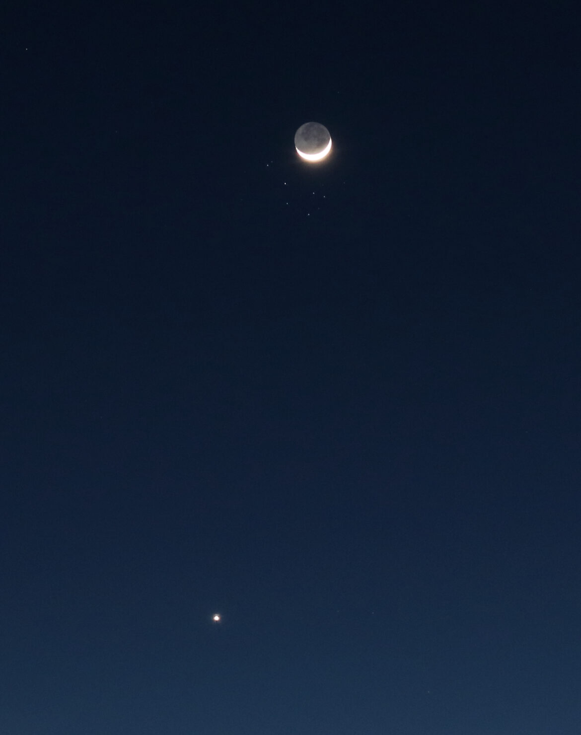 Ecco una foto della bellissima congiunzione di domenica 19 aprile 2026 con anche il pianeta Venere visibile in basso nella foto.